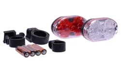 Simson Battery lighting set LED with a 5 red LEDs head- and taillight. Click the taillight easily to a belt or mount it on the seat post or the handlebar, using a Phillips screwdriver and the supplied mounting ring. The lights can then simply be clicked in and out of the mounting ring. Including 2 x...