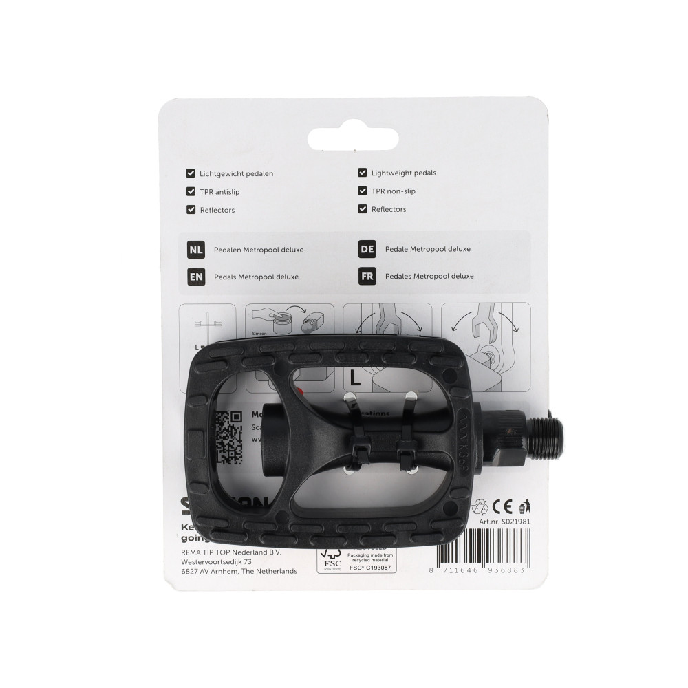 The king among city bike pedals. The Metropool De Luxe pedal is a robust and luxuriously finished pedal, designed for intensive use. The double-sided gray anti-slip layer ensures that your feet never slip off the pedals, even when accelerating powerfully on an e-bike.