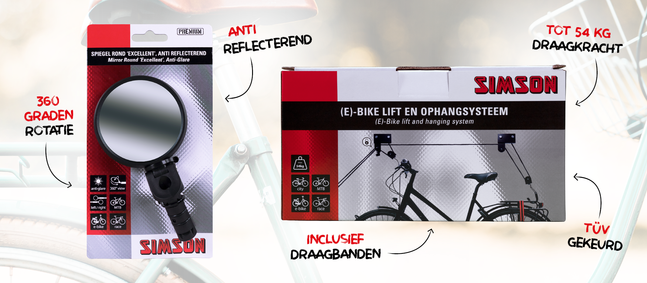 Met een moderne 360-graden rotatie spiegel en een E-bike fietslift heeft Simson haar collectie fietsaccessoires onlangs verder uitgebreid. Deze spiegel en een fietslift zijn onder andere ideaal voor uw E-bike en zijn vanaf nu te vinden in ons uitgebreide assortiment! Bij Simson bieden we voor ieder type gebruiker een geschikt model.