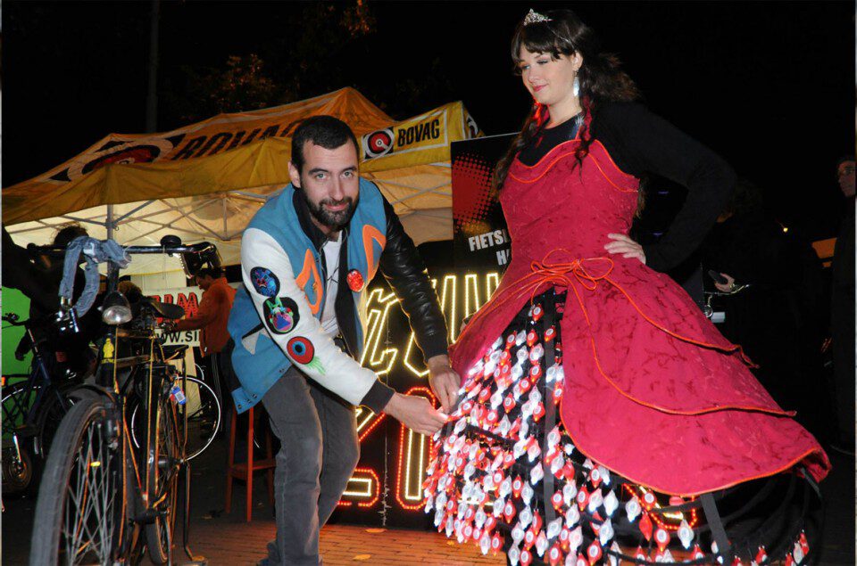 Amsterdams nachtburgemeester Mirik Milan haalt twee lampjes van de jurk van lichtprinses Marije. Zij draagt een jurk met maar liefst 300 lampjes. Met het ingaan van de wintertijd is op het Amsterdamse Leidseplein zaterdagavond, met op de achtergrond de klanken van dj Vincenzo, de campagne begonnen van de Fietsersbond met de titel ‘Ik wil je zien’. De aftrap van de campagne werd samen met de gemeente Amsterdam, Simson en de Bovag georganiseerd