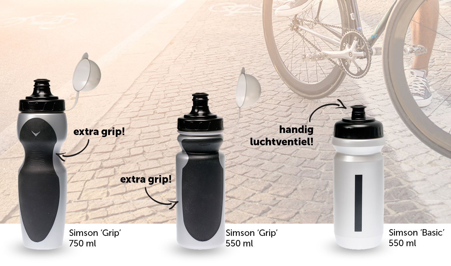 Naast het ‘Basic’ model zijn er twee modellen beschikbaar die voorzien zijn van extra grip. Deze bidons hebben naast een ergonomisch design ook voor een gedeelte een rubberen afwerking meegekregen. Dit geeft een zeer goede grip, en optimaal comfort aan de handen. De dop en de afsluitbare trektuit maken de bidons waterdicht. Deze bidons zijn zowel leverbaar in een 550ml en een 750ml uitvoering. Beide bidons worden geleverd met een verwijderbare stofkap om vuil op de drinktuit te voorkomen.