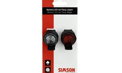 De Simson Batterij LED set Flexy zwart heeft een flexibele, lichtgewicht behuizing. Uitgevoerd in mat zwart siliconen. De universele siliconen bevestigingsband zorgt voor een eenvoudig gebruik op bijvoorbeeld de zadelpen of het stuur. De lampjes hebben een aan, uit en twee knipper functies. De drukk...