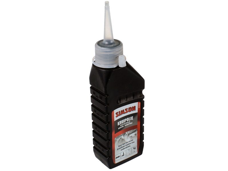 Spray de Kruipolie op het gewenste onderdeel voor een smeer- en beschermlaag tegen roestvorming en het piepen en knarsen van onderdelen. De Simson kruipolie wordt geleverd in een 100 ml flacon met tuitje voor een nauwkeurige dosering op de gewenste plaats.